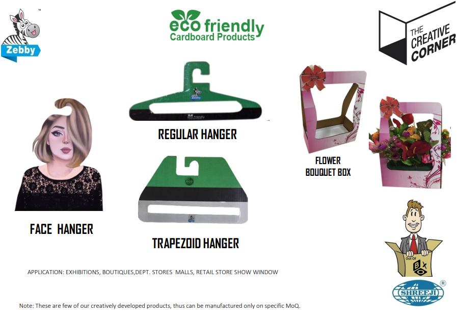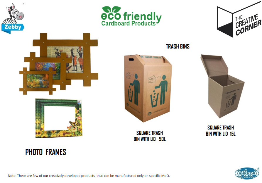 Shreeji, Manufactures Corrugated Boxes, cartons, rolls, Fitments , Trash Bins & Allied Packaging materials, under the brand Shreeji. And have introduced Eco-Friendly Cardboard products such as: Trash Bins, Floor Mats, Food Boxes, Gift Boxes, Toys, Play House, Flower Bouquet Box, etc, under the brand Zebby.